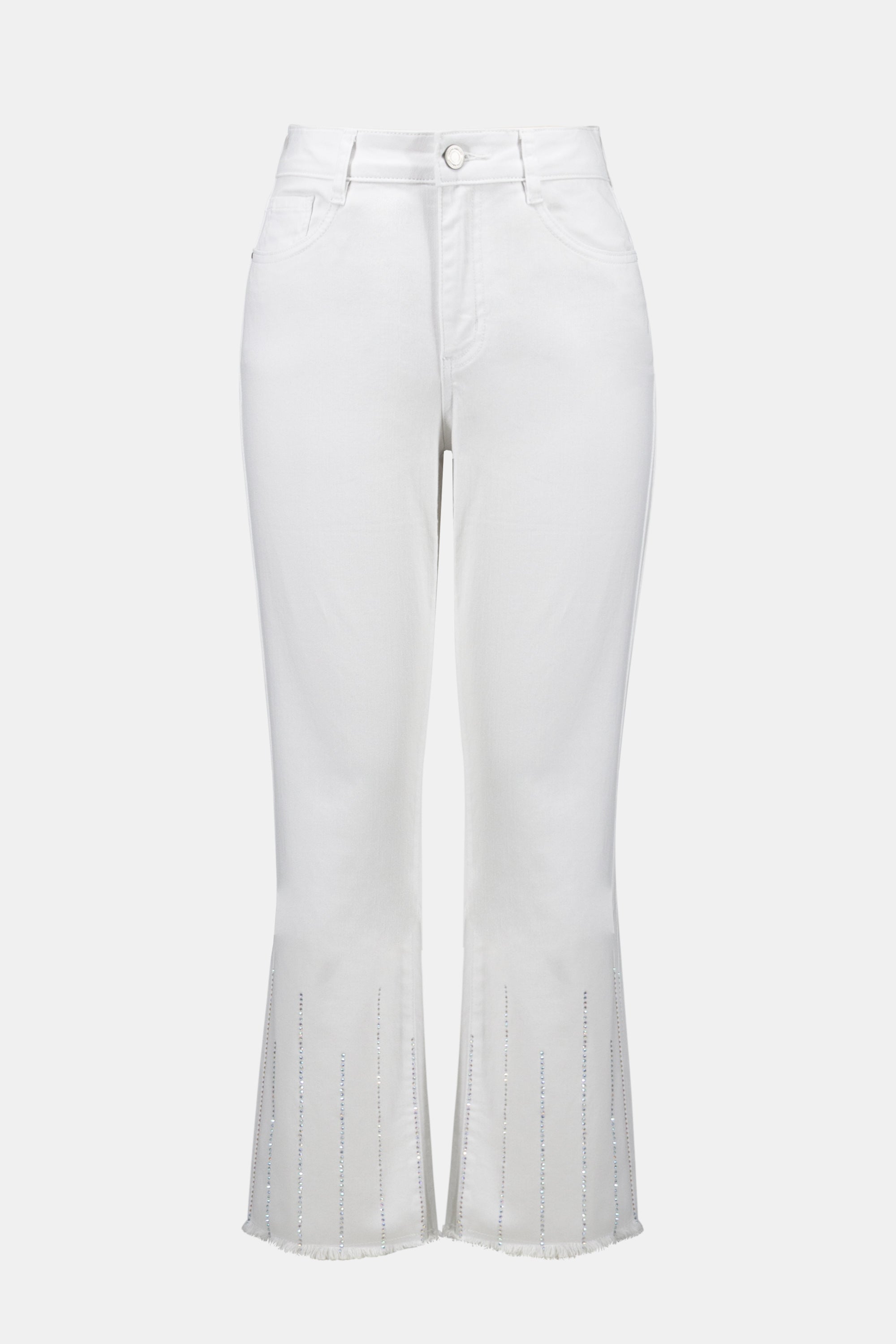 These Joseph Ribkoff FEATHERWEAVE™ denim crop pants feature a straight-leg silhouette, frayed hems, and heat-transfer rhinestones for subtle shine.